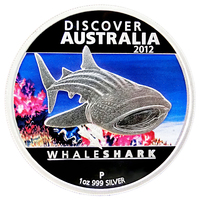 Sie erhalten hier eine Discover Australia Silbermünze - Whale Shark - 2012 - 1 Unze PP coloriert