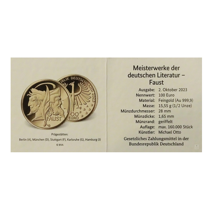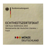 Sie erhalten eine 100 Euro Goldmünze 2023 Meisterwerke der Deutschen Literatur - Faust.