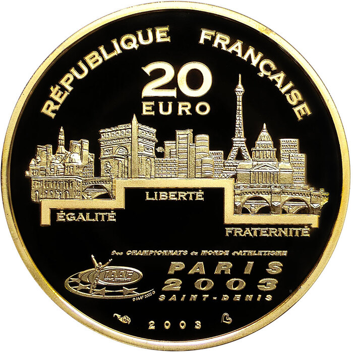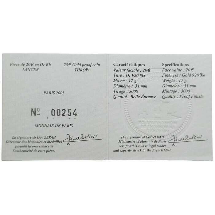 Sie erhalten eine Goldmünze 20 Euro Frankreich IX. Leichtathletik WM in Paris - Kugelstoßen 2003 - Feingold 15,64 Gramm.