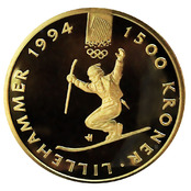 Goldmünze Norwegen Lillehammer Telemark Skiläufer 1994 - PP - mit Etui und Zertifikat - 1/2 Unze Feingold