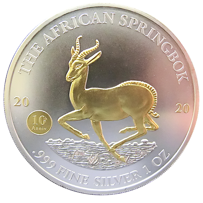 Sie erhalten eine Silbermünze Afrikanischer Springbock Gabun 2020 - 1 Unze Feinsilber Gilded