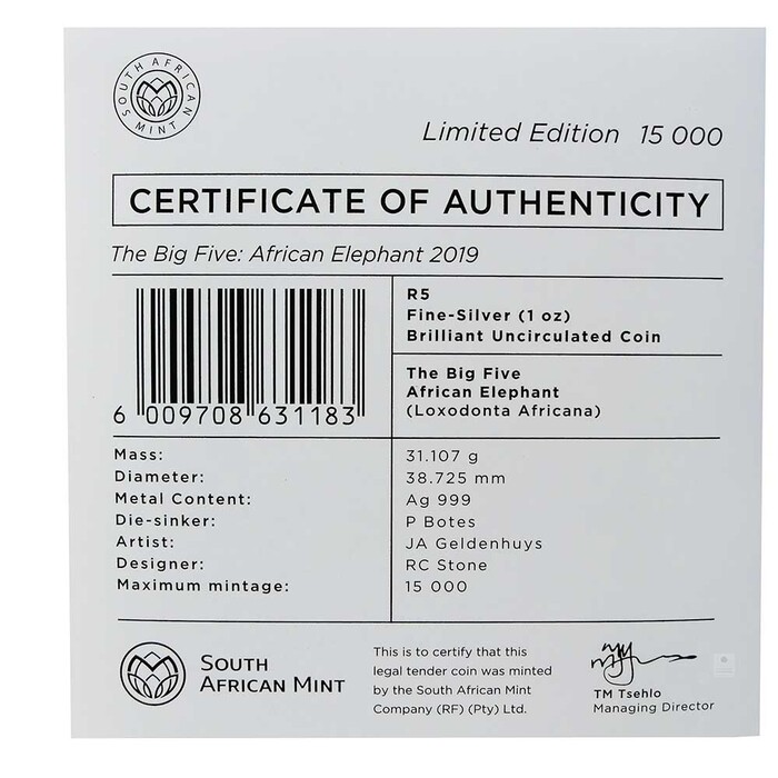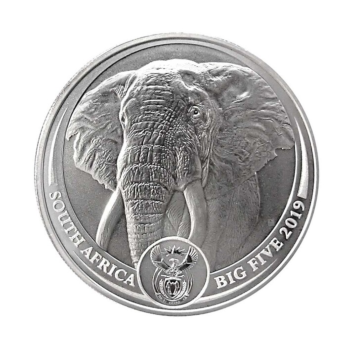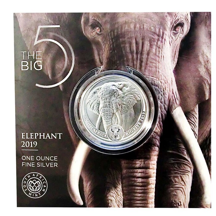 Sie erhalten eine Silbermünze Big Five Elefant 2019 Südafrika im Blister - 1 Unze 999 Feinsilber